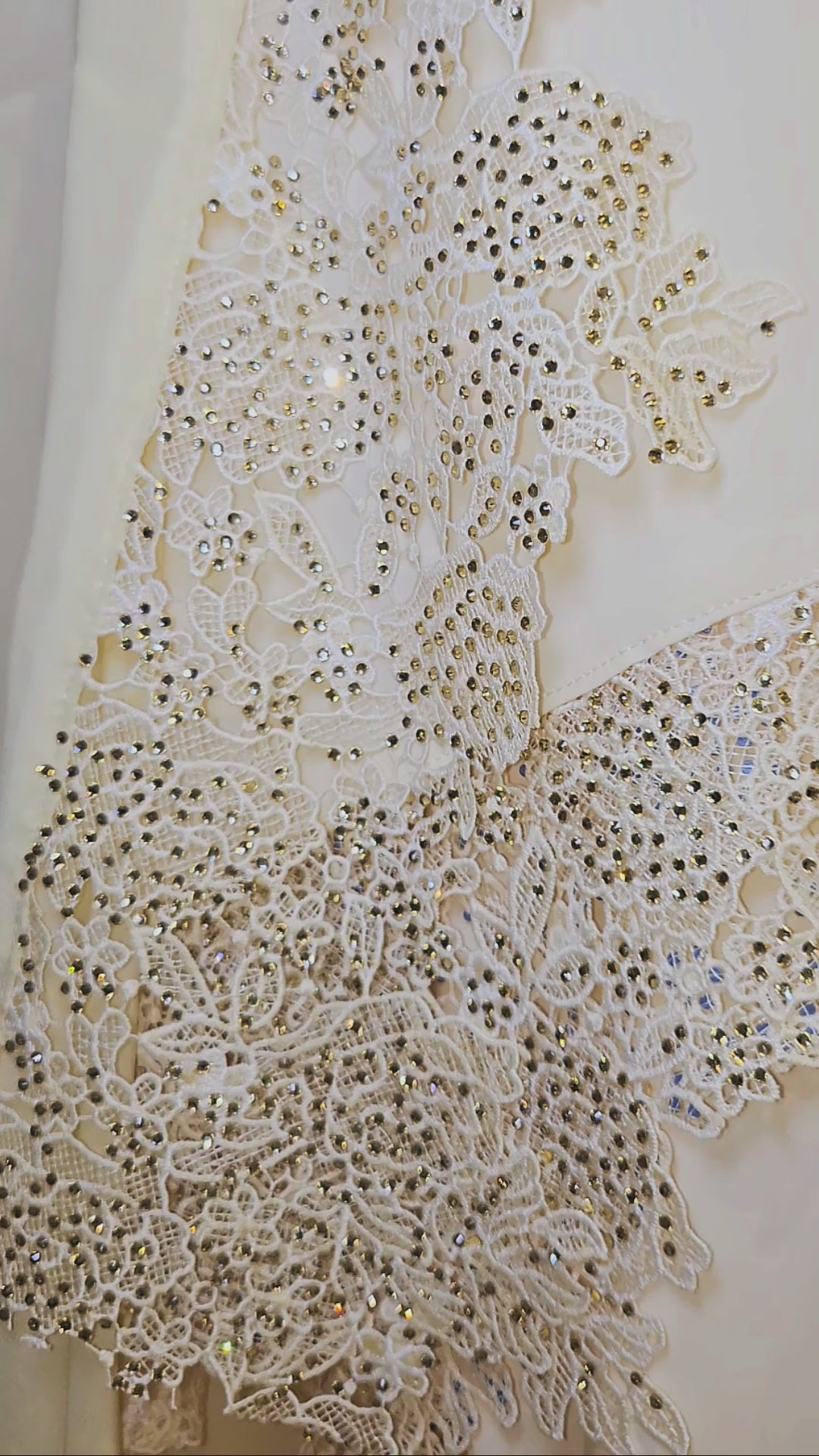 Completing the look is the matching veil, elegantly finished with crystal lace along the longer edge. This delicate detail adds a soft yet glamorous touch, perfectly complementing the overall design.